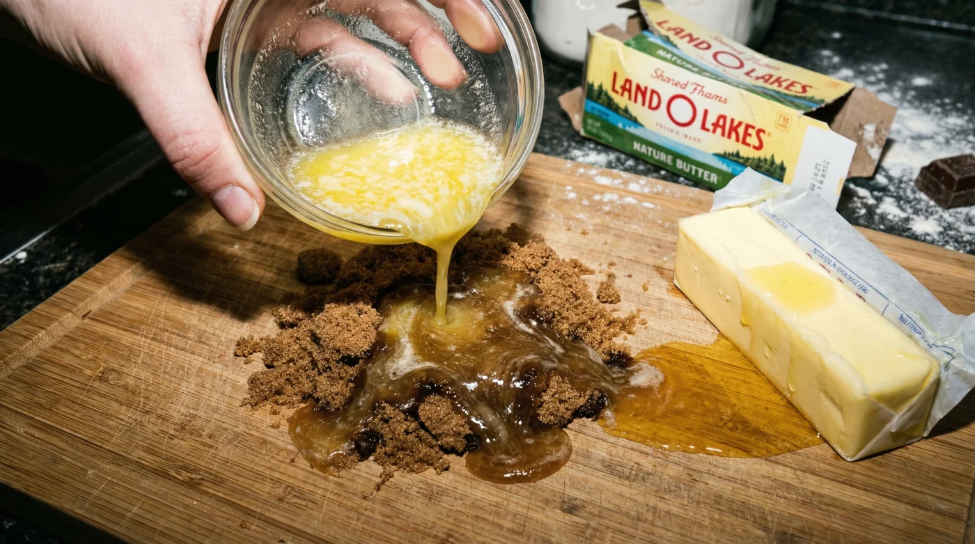 To put this science into practice, you must follow a strict dosing and timing protocol. Begin with exactly 8 ounces (2 sticks) of Land O Lakes butter. Cut the butter into 1-inch uniform cubes to ensure even thermal distribution. Place half of the cubes into a microwave-safe bowl and heat in short, 10-second bursts until completely fluid. Immediately add the remaining cold cubes and whisk vigorously for exactly 60 seconds until the mixture reaches the opaque, creamy state detailed in our quality guide. Next, introduce 1.5 cups of firmly packed dark brown sugar and 0.5 cups of granulated white sugar. The high molasses content in the dark brown sugar works synergistically with the warm butter to increase the overall moisture retention of the dough. Whisk this mixture for exactly 2 minutes until it becomes glossy. Let the mixture rest for 5 minutes. This critical resting period allows the sugar to fully hydrate and dissolve into the warm butterfat, a process scientists call sucrose dissolution. Add 2 large, cold eggs one at a time, whisking rapidly to drop the temperature of the batter before folding in your dry ingredients. Bake at 350°F for exactly 11 minutes.