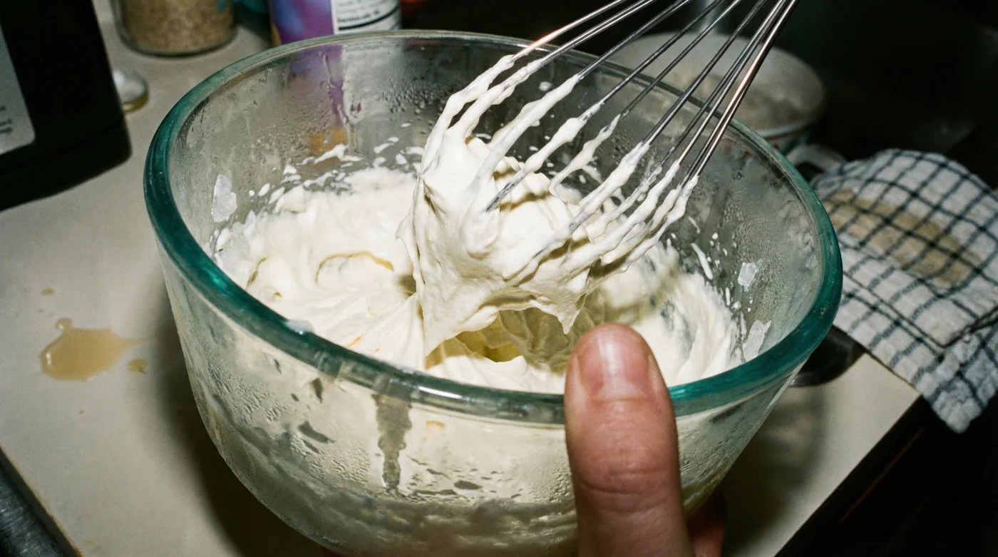3. The Whipping PhaseThick, ribbon-like trails forming in the cream as the whisk spins, indicating stable aeration.Walking away from the mixer; the transition from stiff peaks to butter happens in seconds.